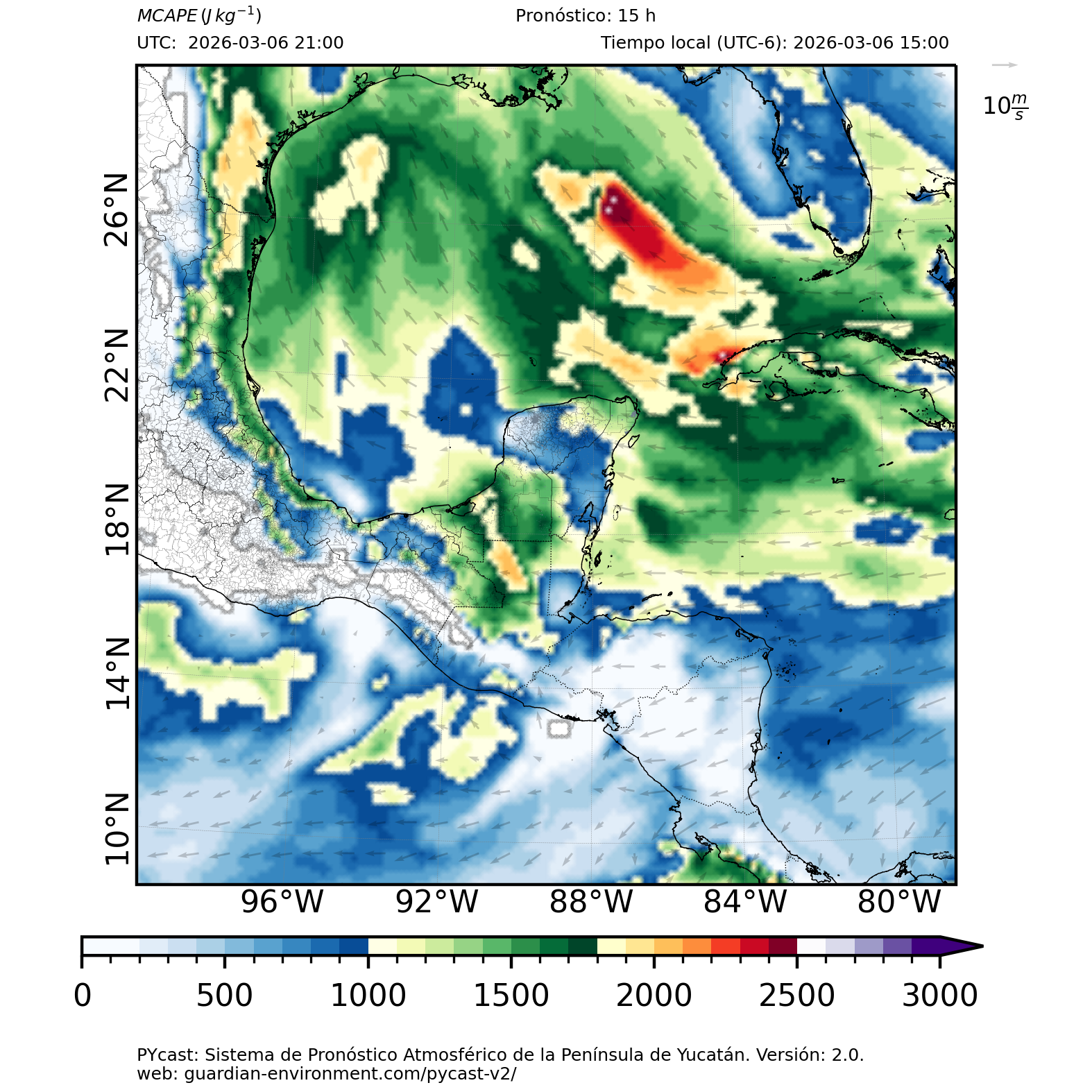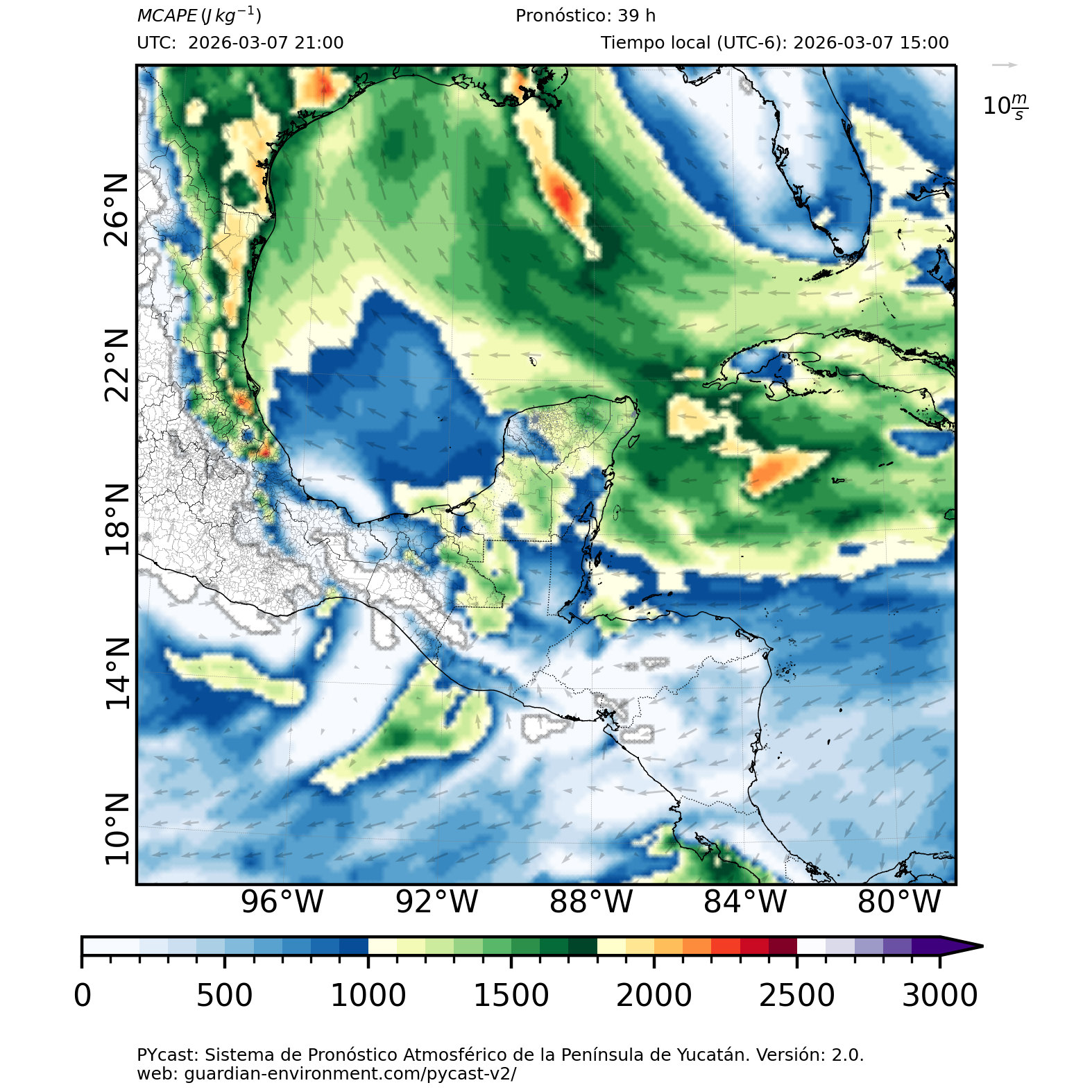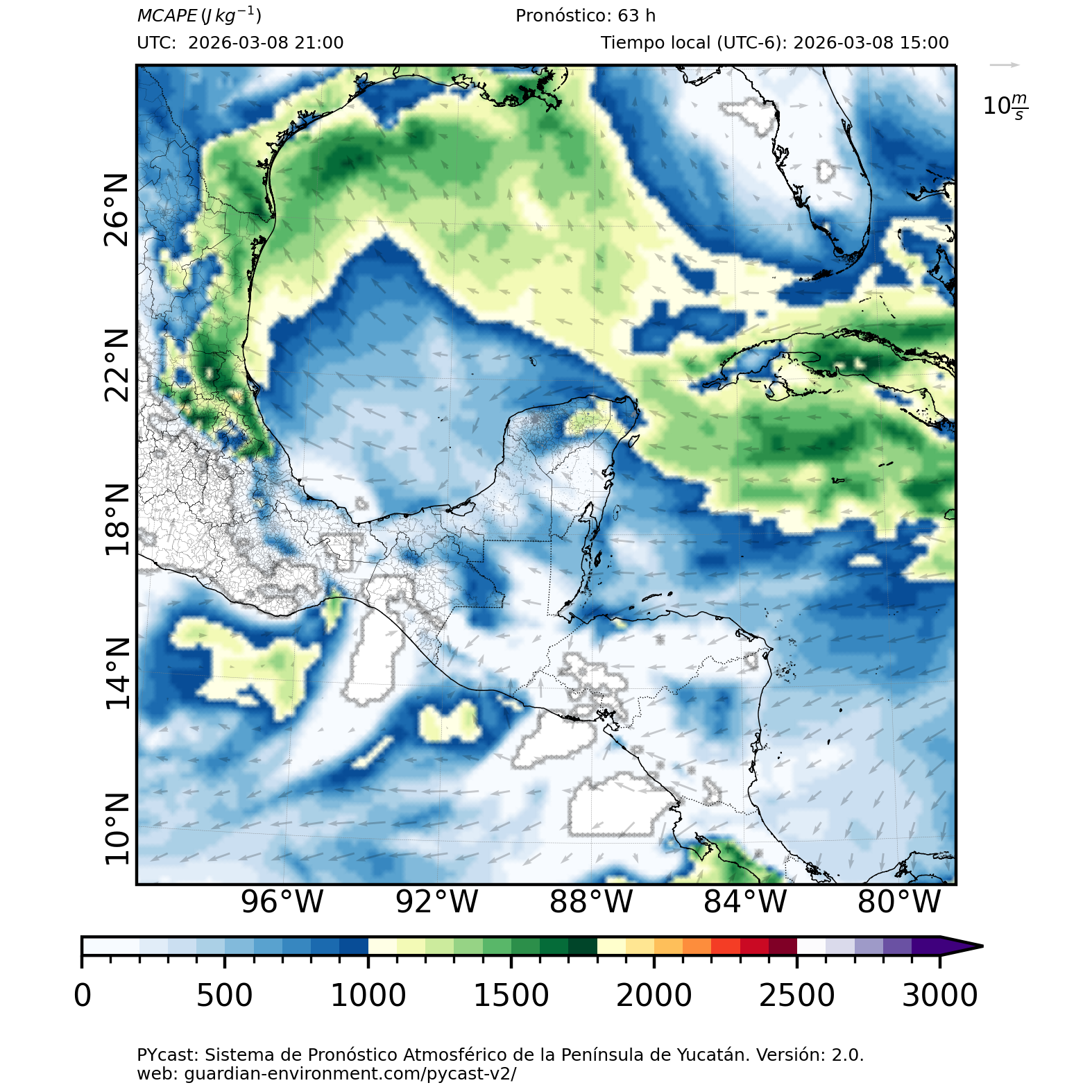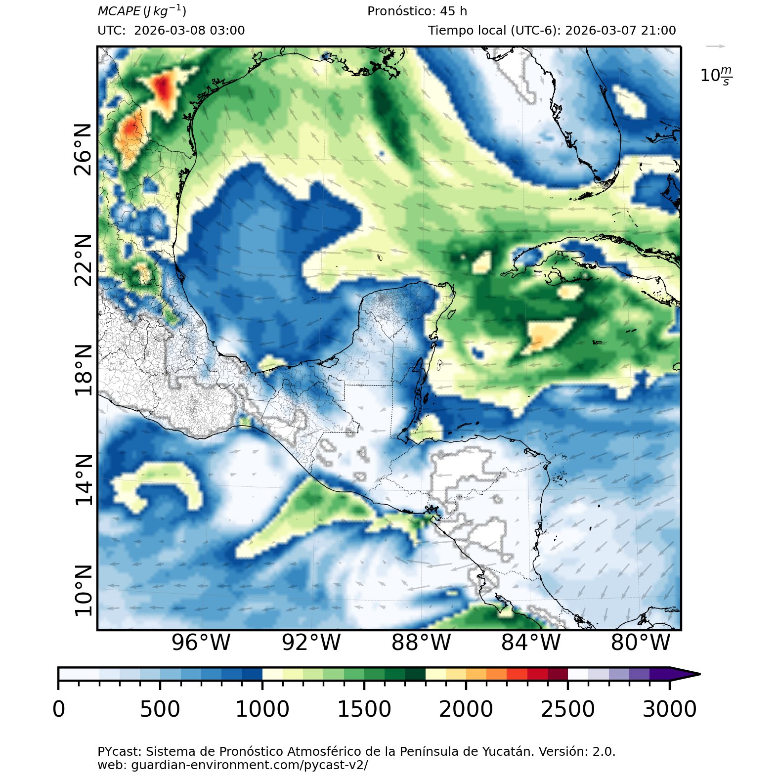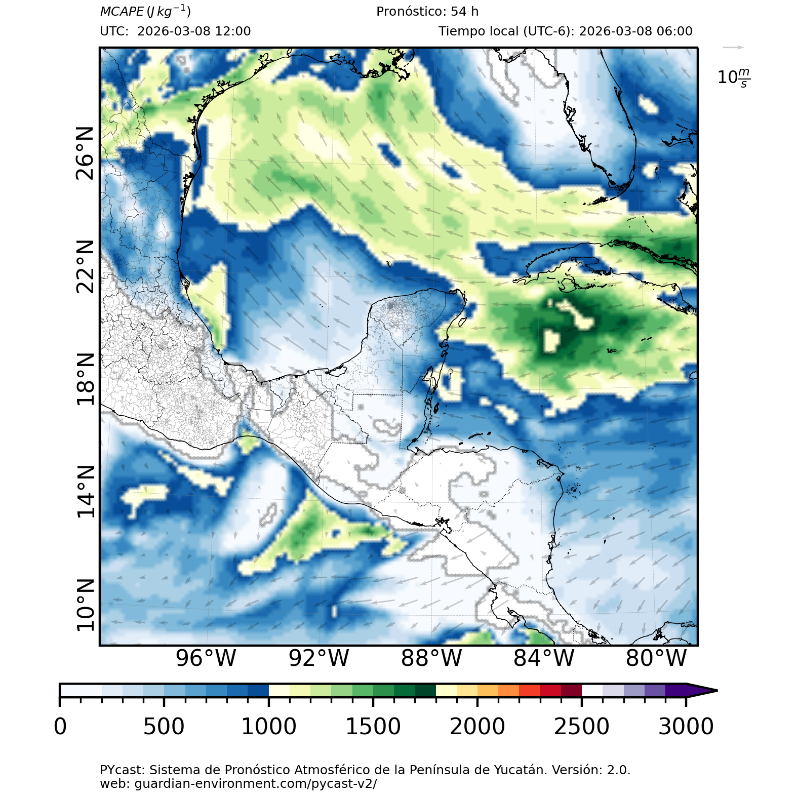 | 1000 – 2000 | Buen potencial para tormentas débiles. | Los sistemas históricos de precipitación intensa tienden a ocurrir acompañados de valores de MCAPE altos (> 1000 J/kg) (Guo et al., 2025). |