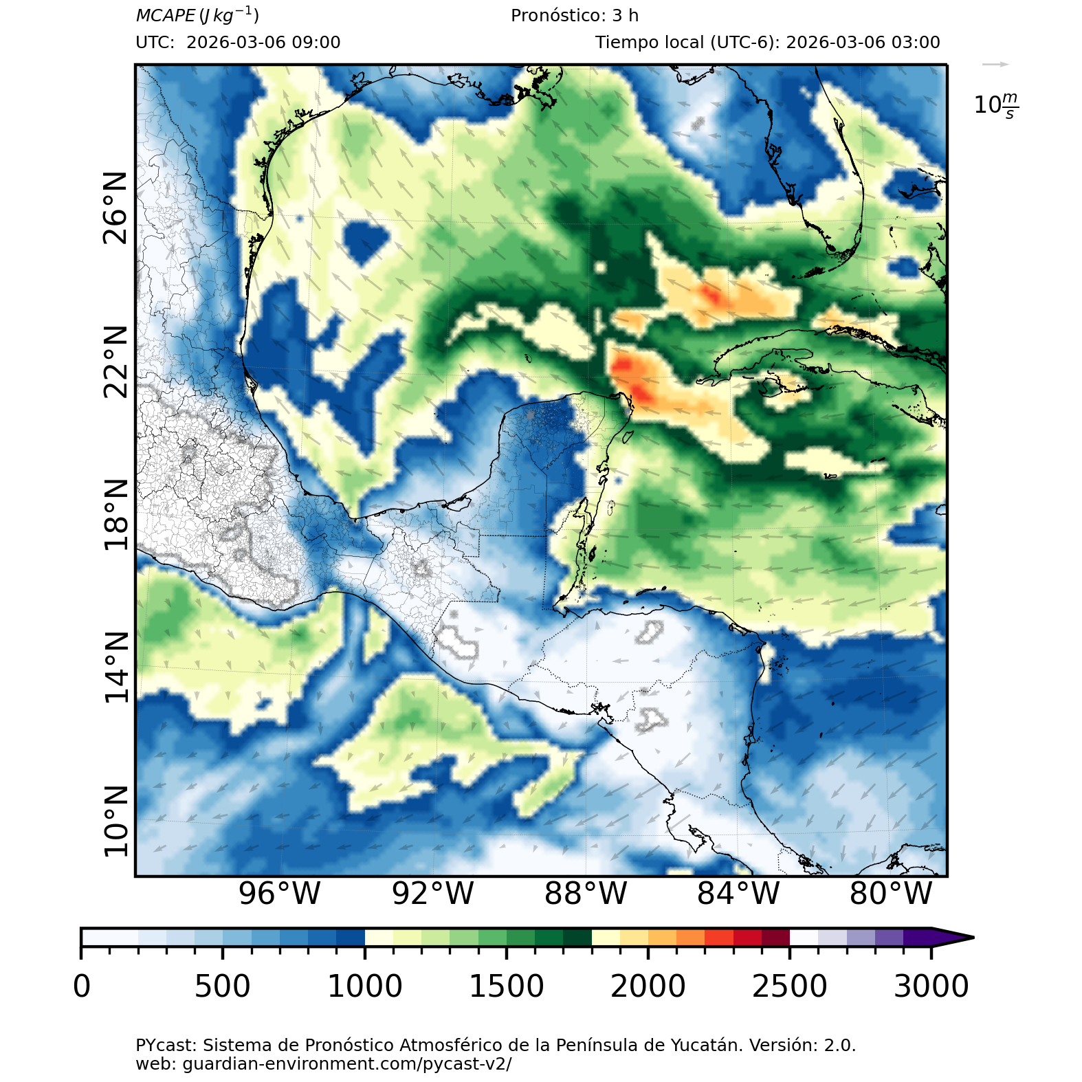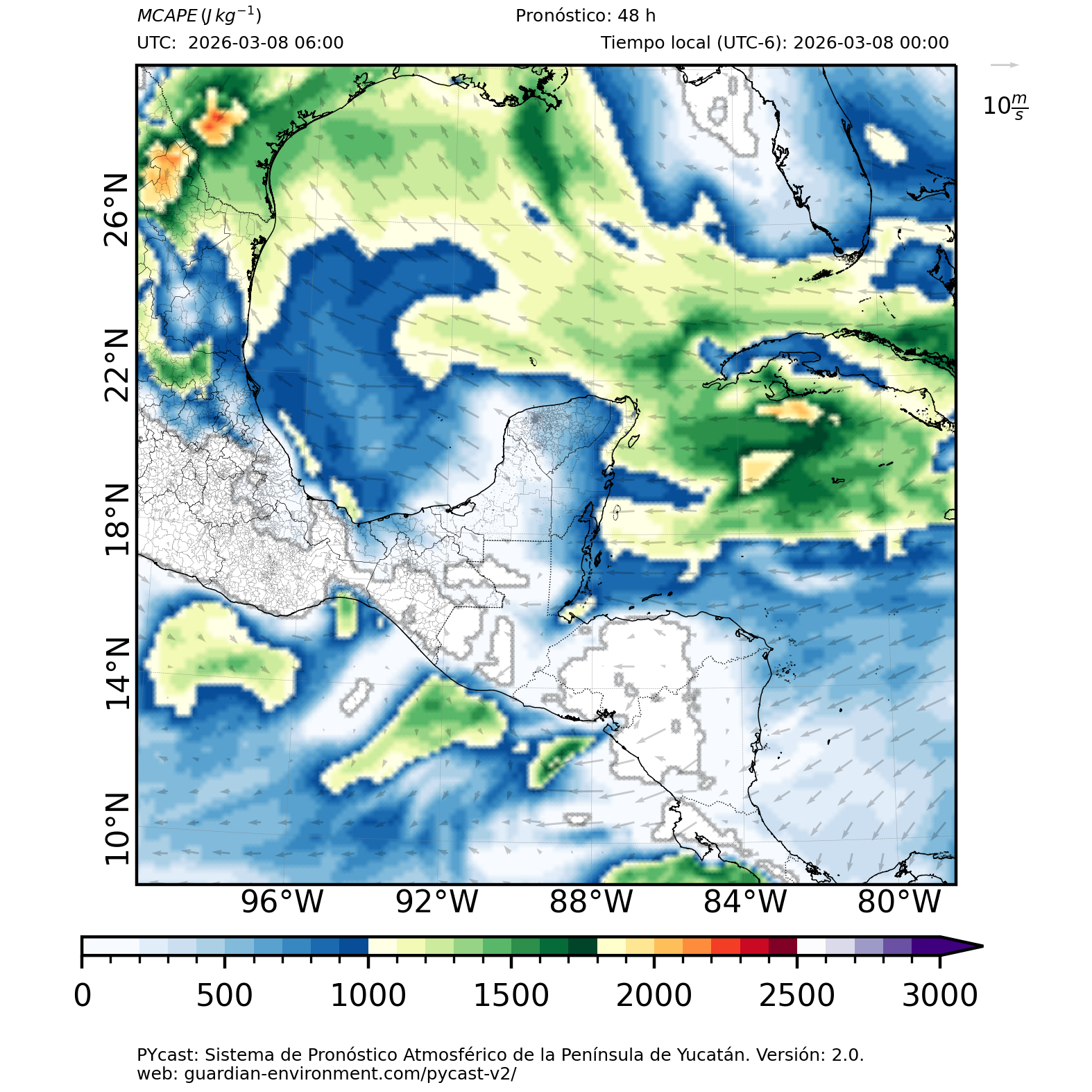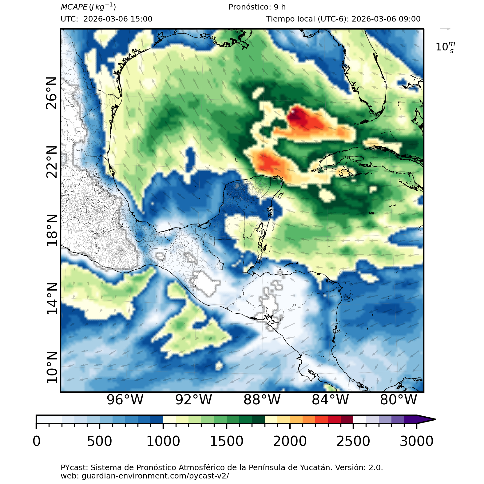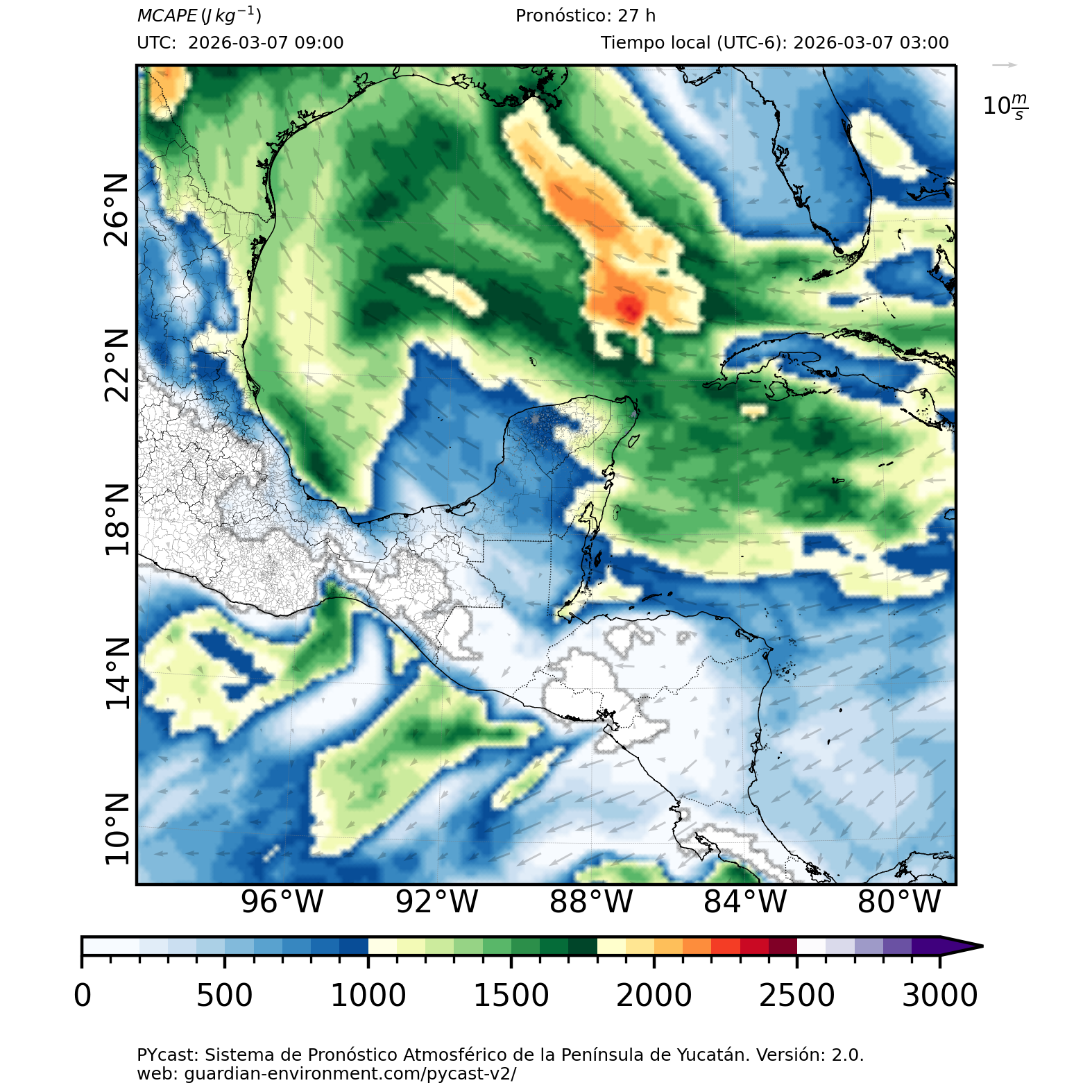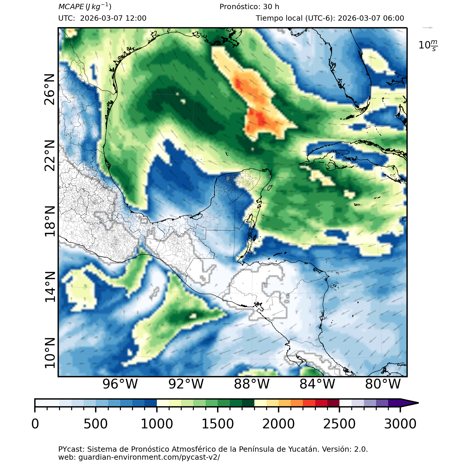 | 1000 – 2000 | Buen potencial para tormentas débiles. | Los sistemas históricos de precipitación intensa tienden a ocurrir acompañados de valores de MCAPE altos (> 1000 J/kg) (Guo et al., 2025). |