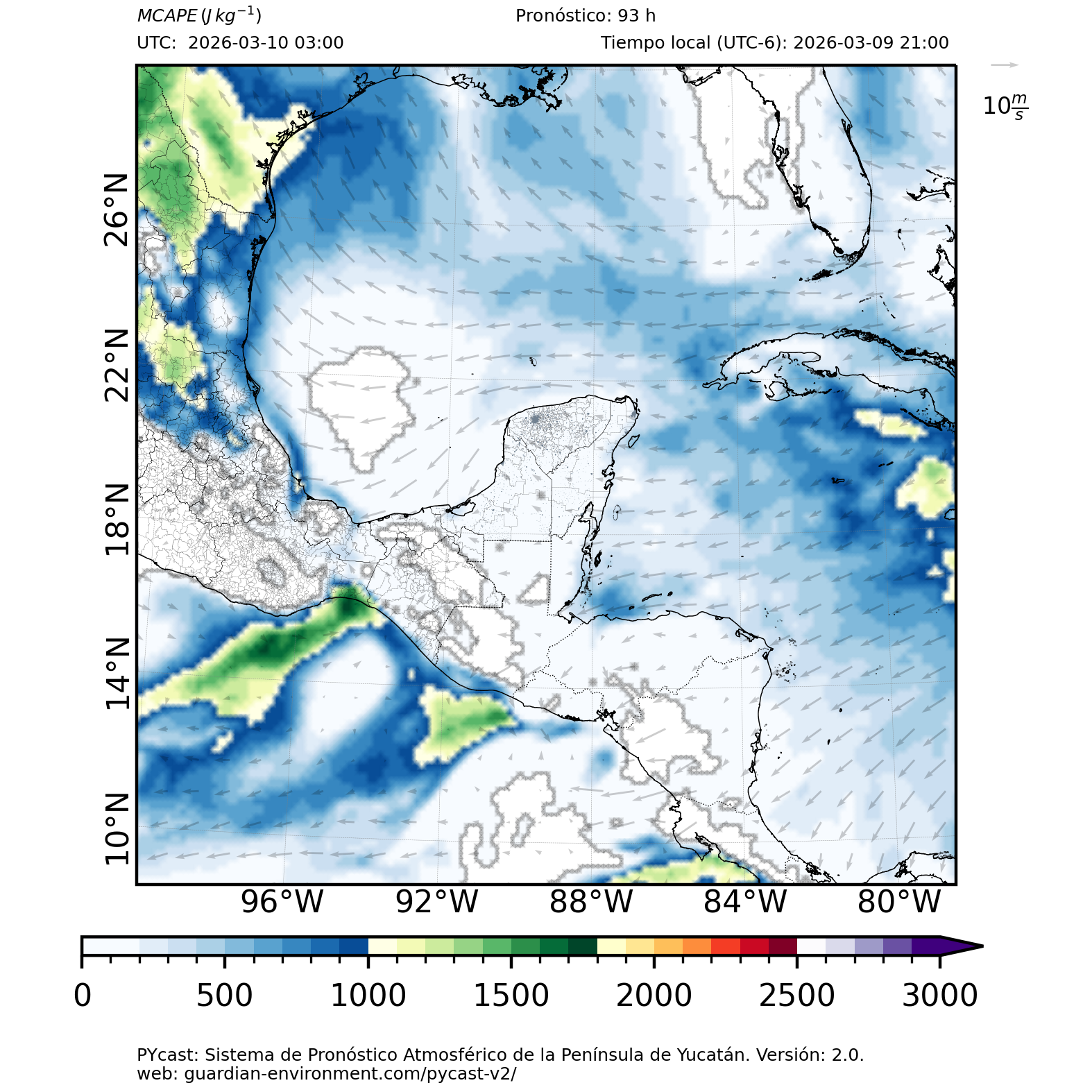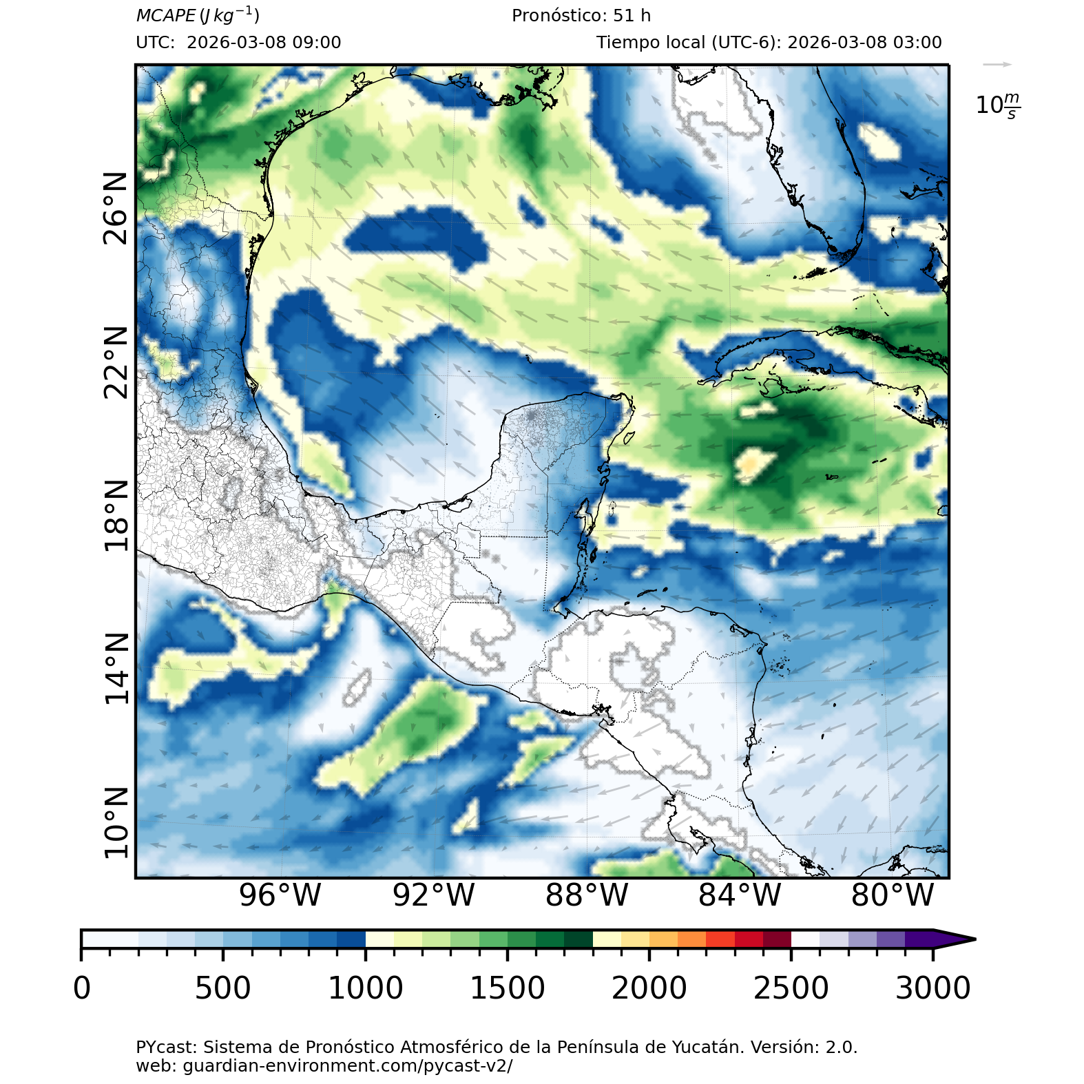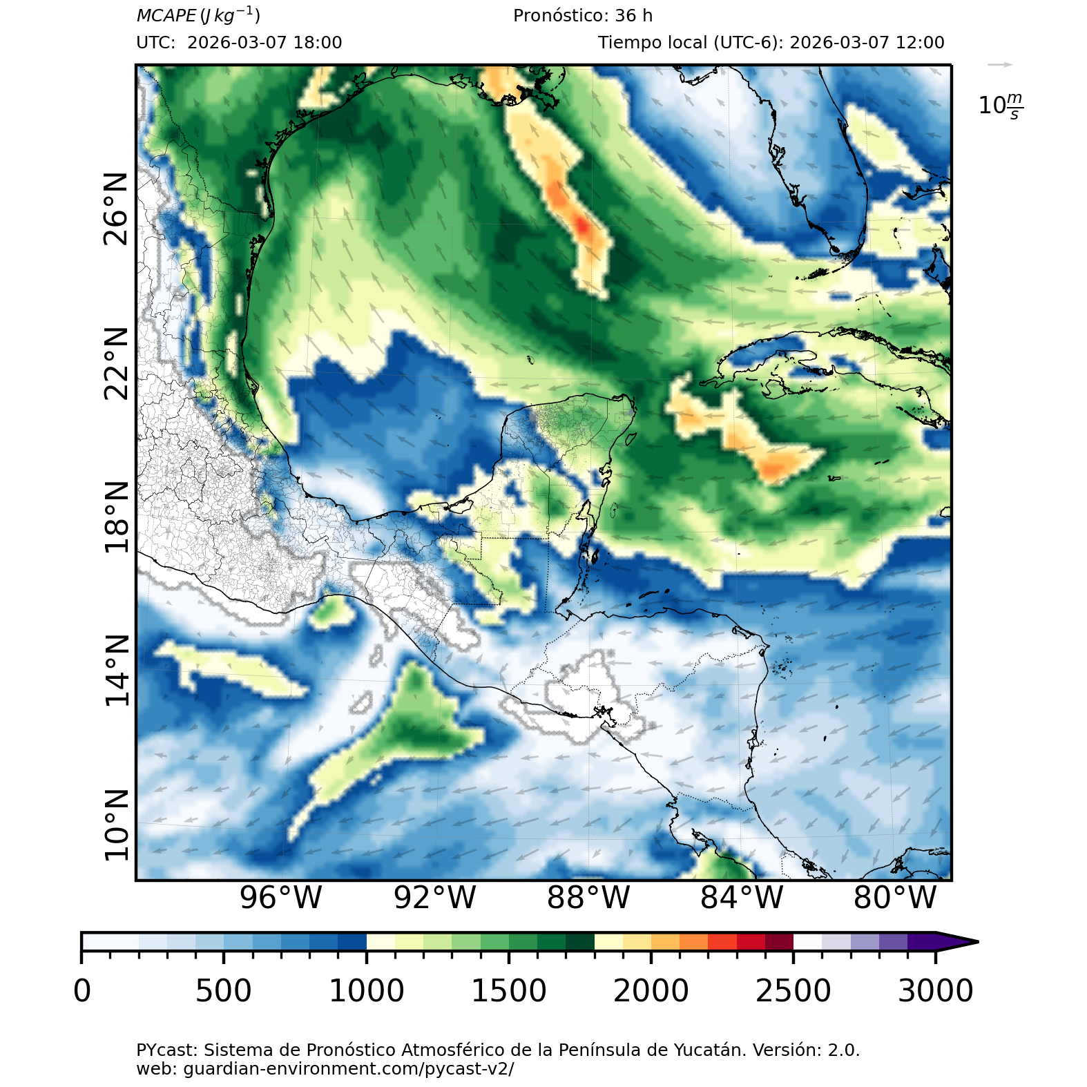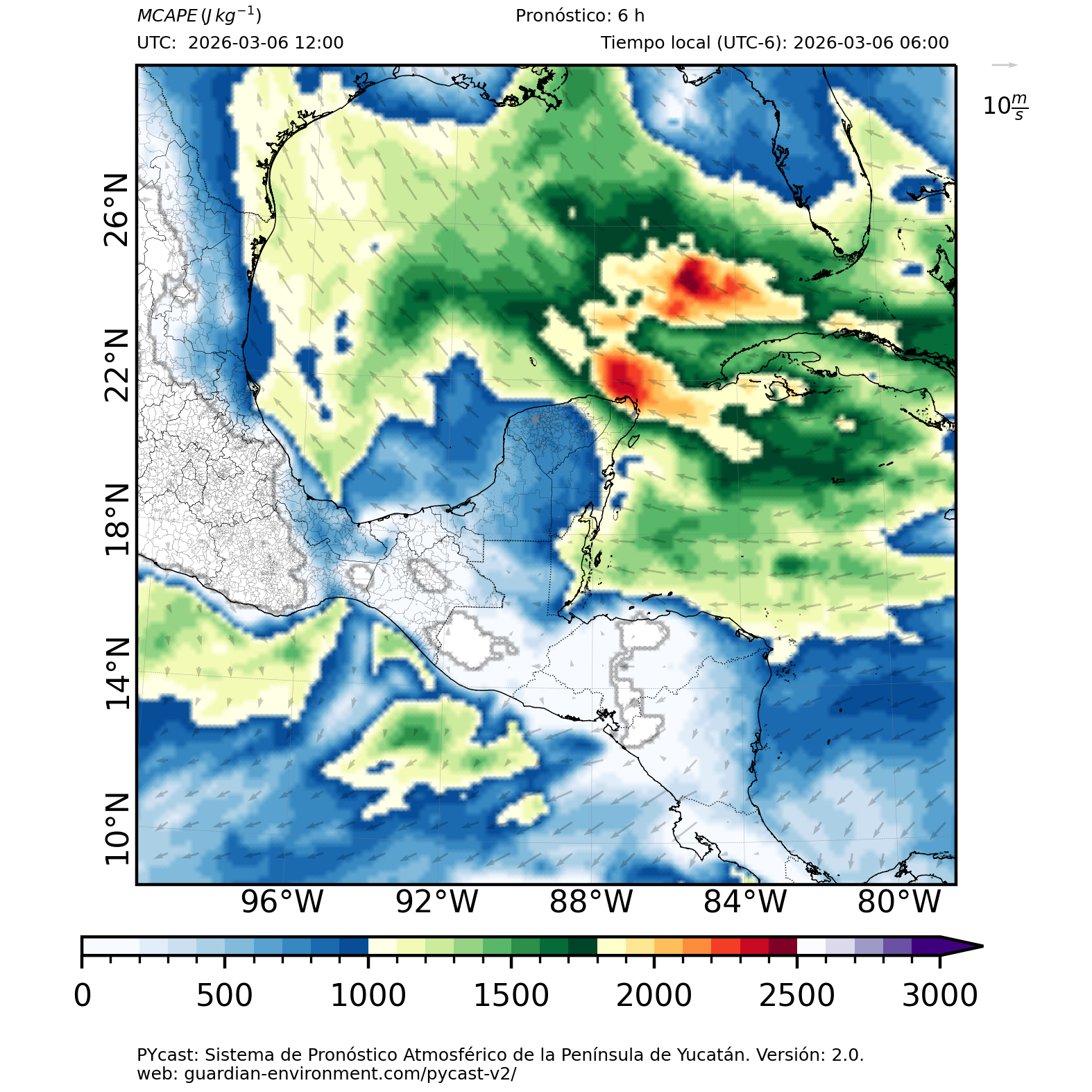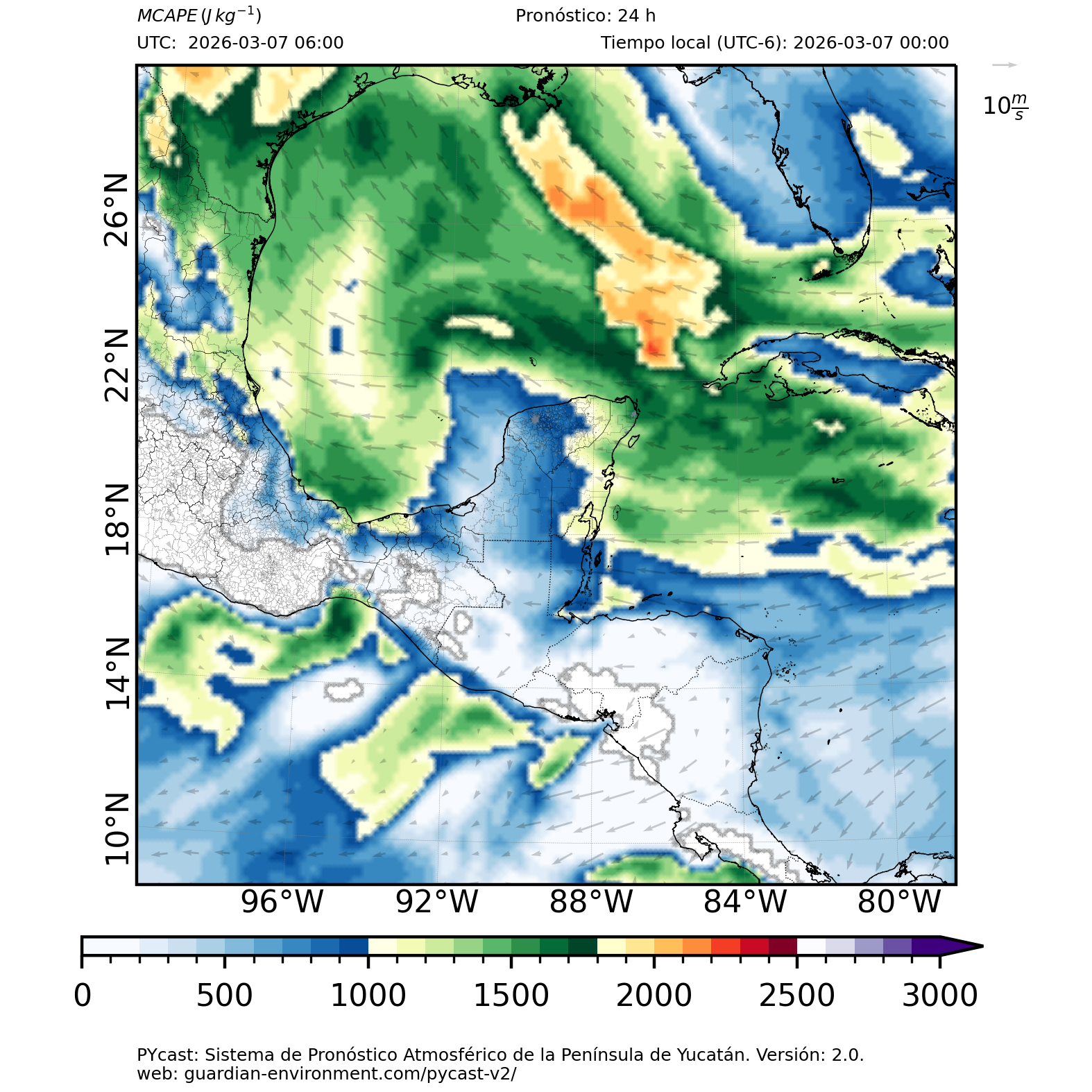 | 1000 – 2000 | Buen potencial para tormentas débiles. | Los sistemas históricos de precipitación intensa tienden a ocurrir acompañados de valores de MCAPE altos (> 1000 J/kg) (Guo et al., 2025). |