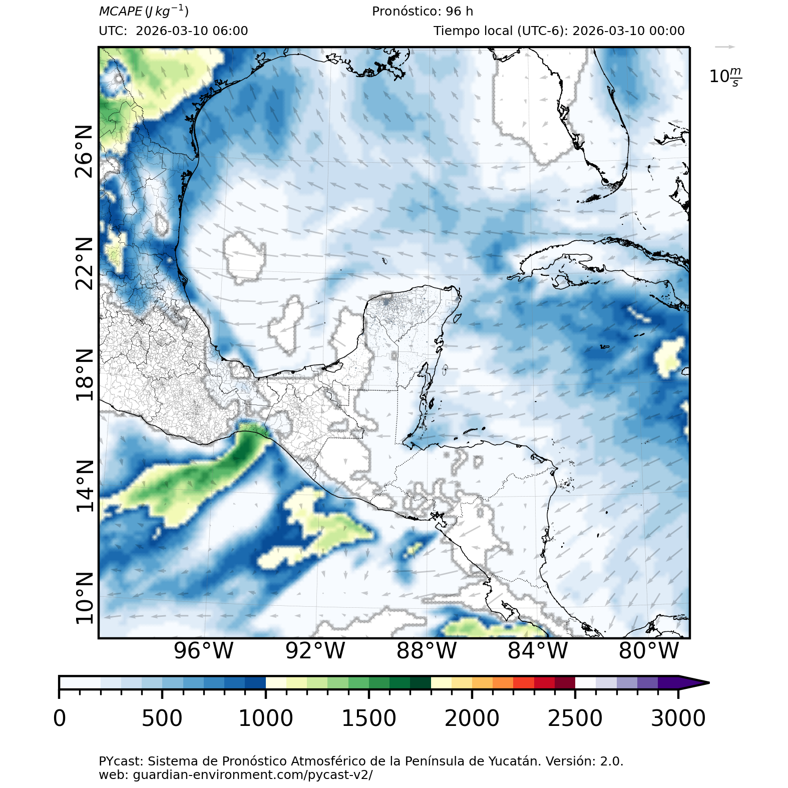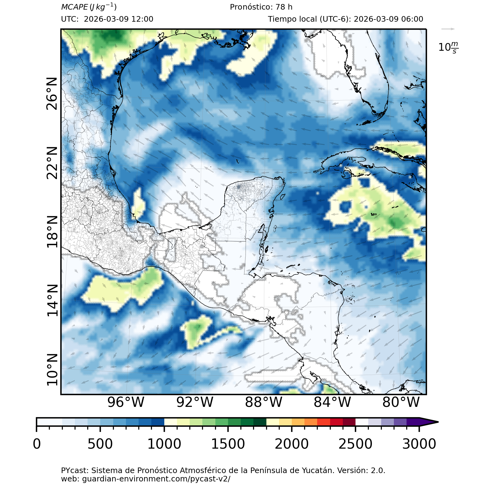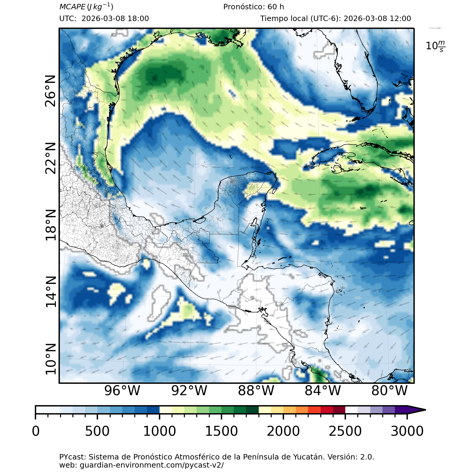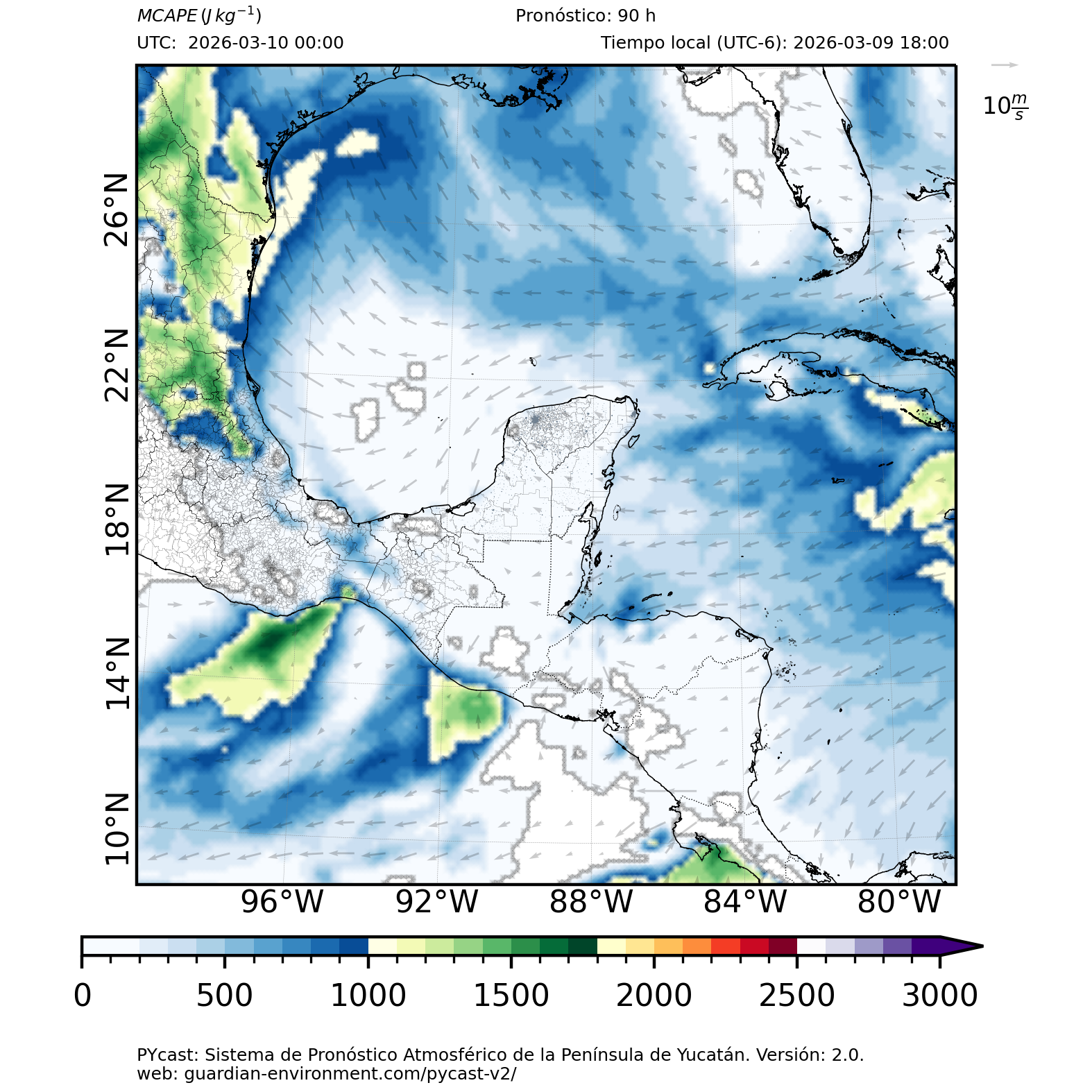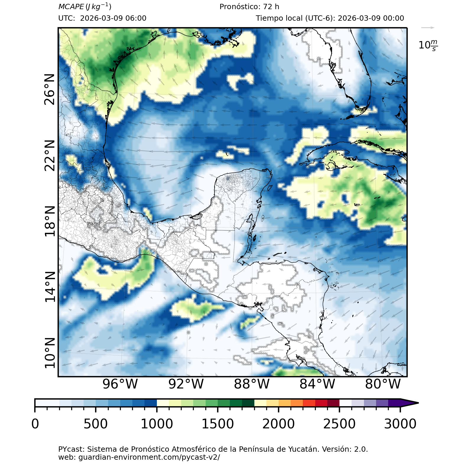 | 1000 – 2000 | Buen potencial para tormentas débiles. | Los sistemas históricos de precipitación intensa tienden a ocurrir acompañados de valores de MCAPE altos (> 1000 J/kg) (Guo et al., 2025). |