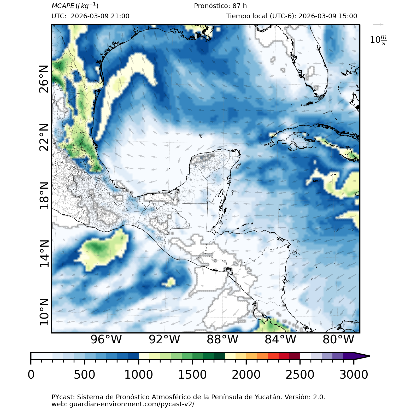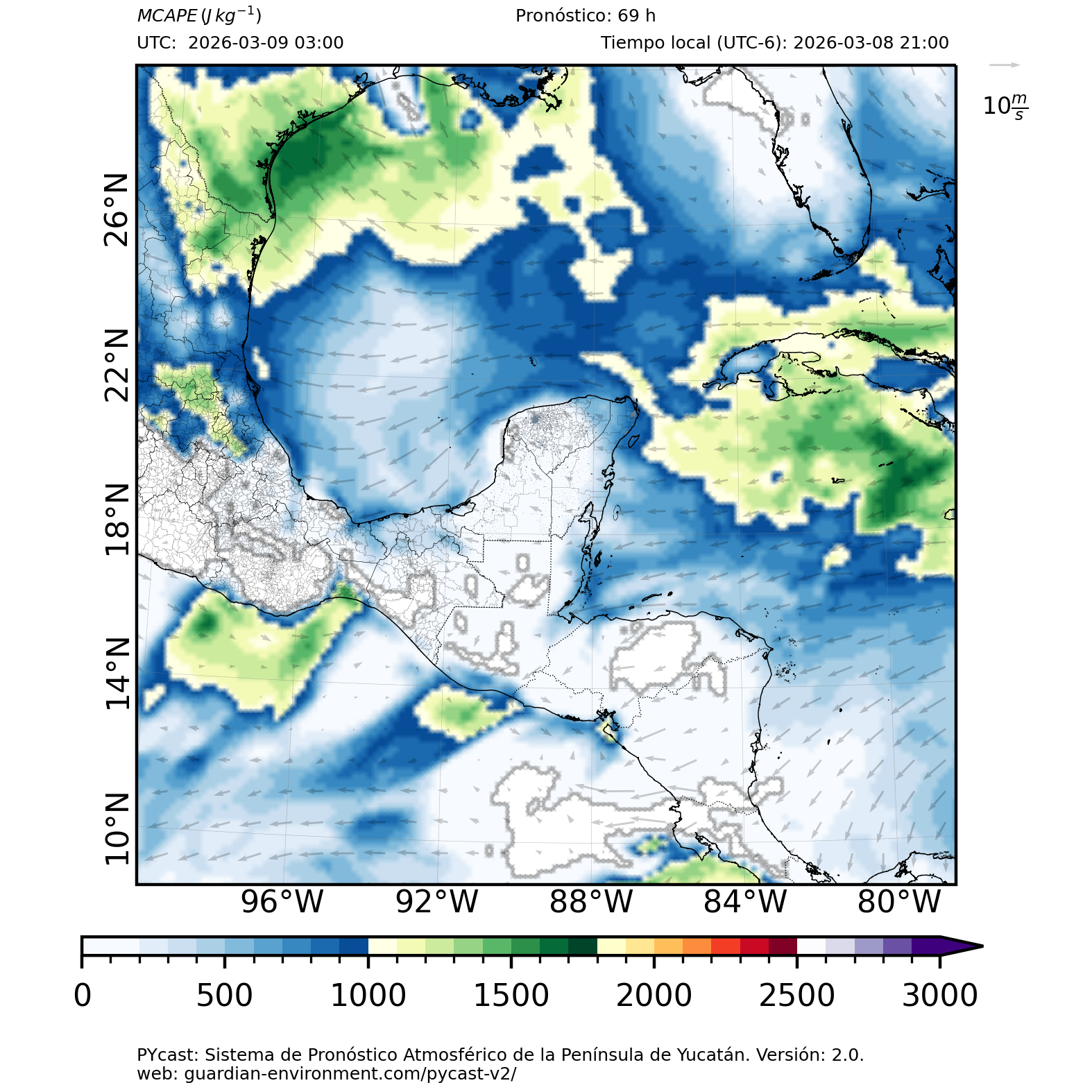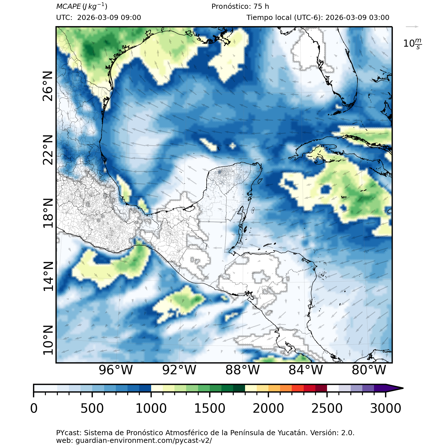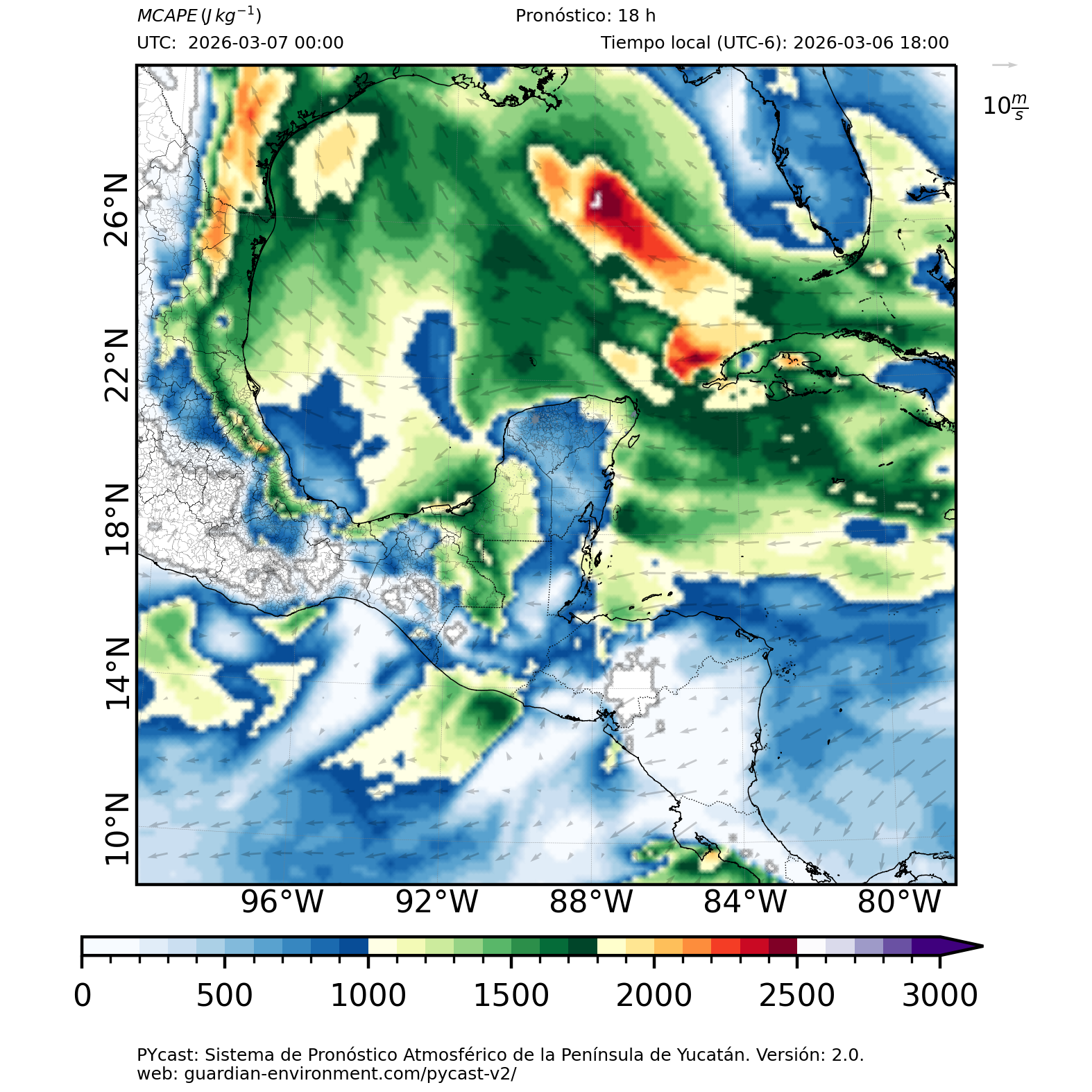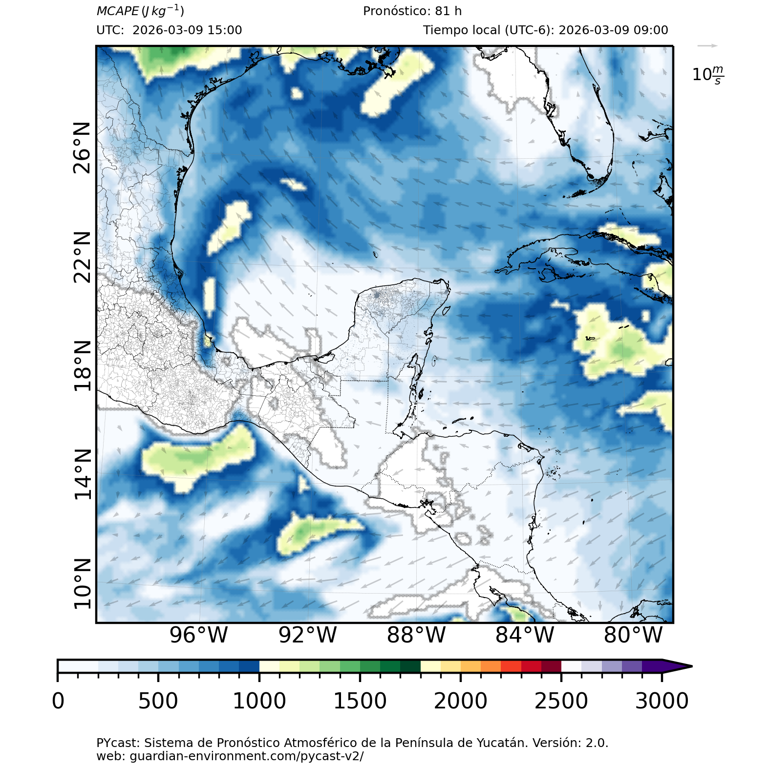 | 1000 – 2000 | Buen potencial para tormentas débiles. | Los sistemas históricos de precipitación intensa tienden a ocurrir acompañados de valores de MCAPE altos (> 1000 J/kg) (Guo et al., 2025). |